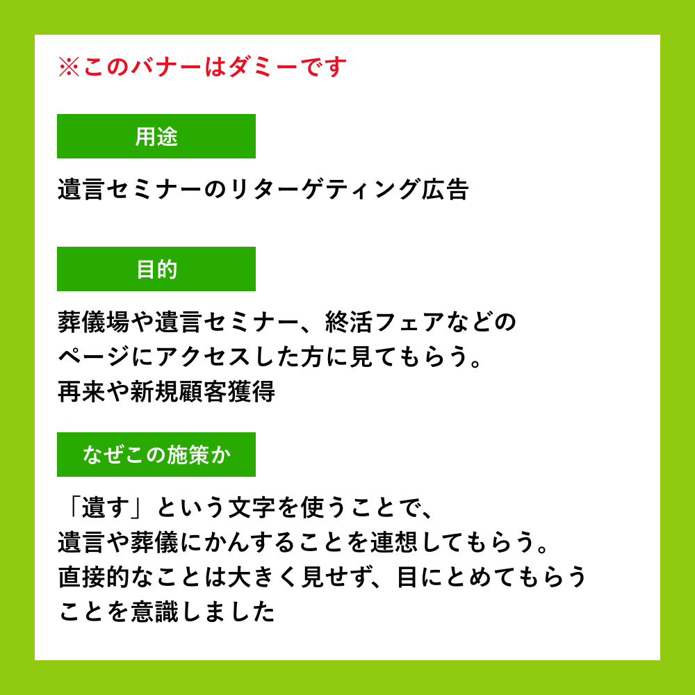 仏壇店のリターゲティングバナーをつくってみました。リスト取得の目的とかもあったりしそうだなーと思ったり。