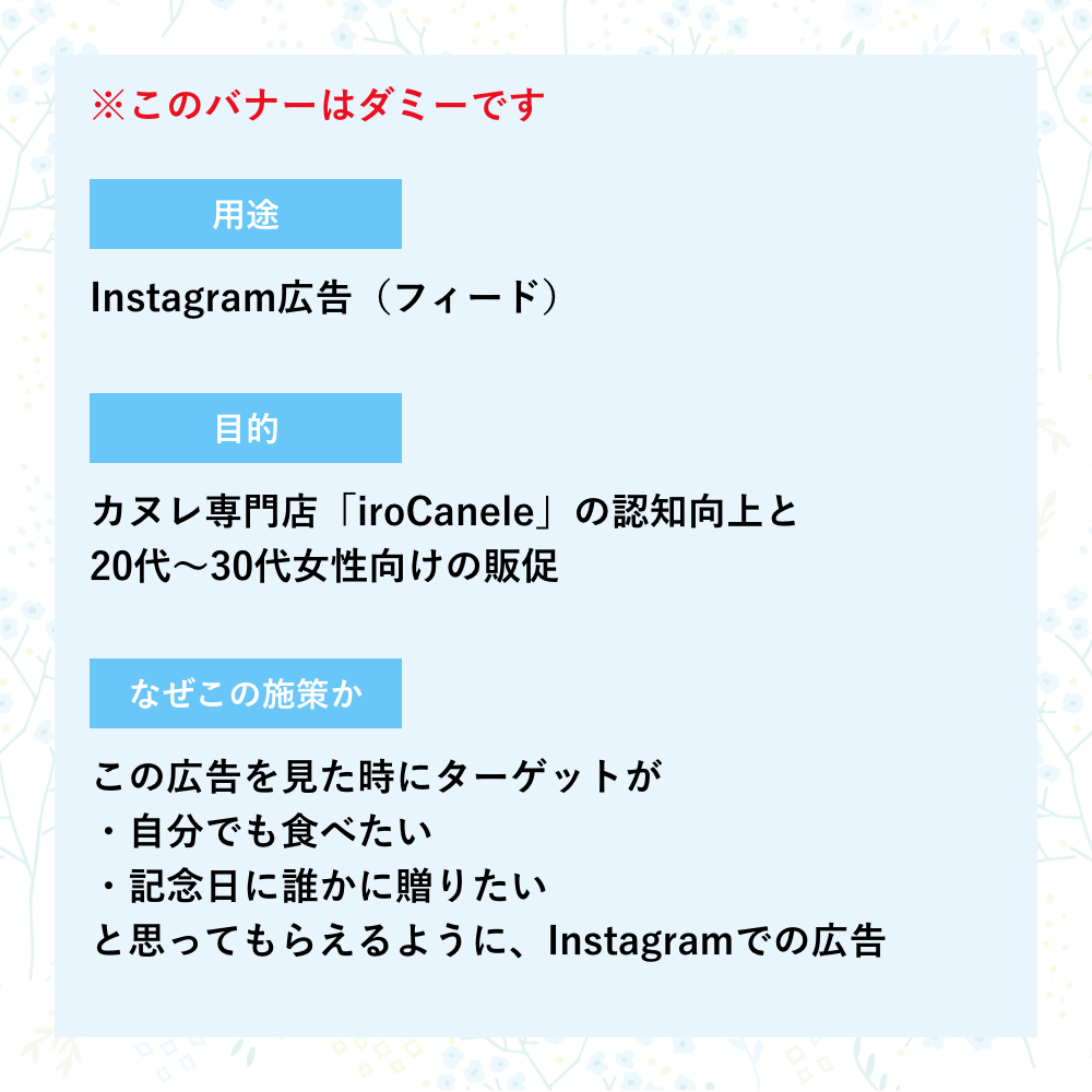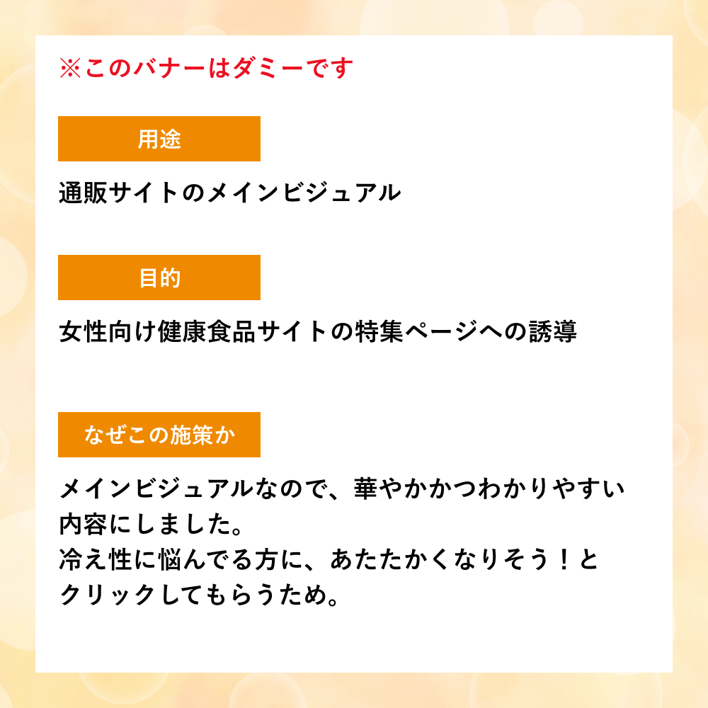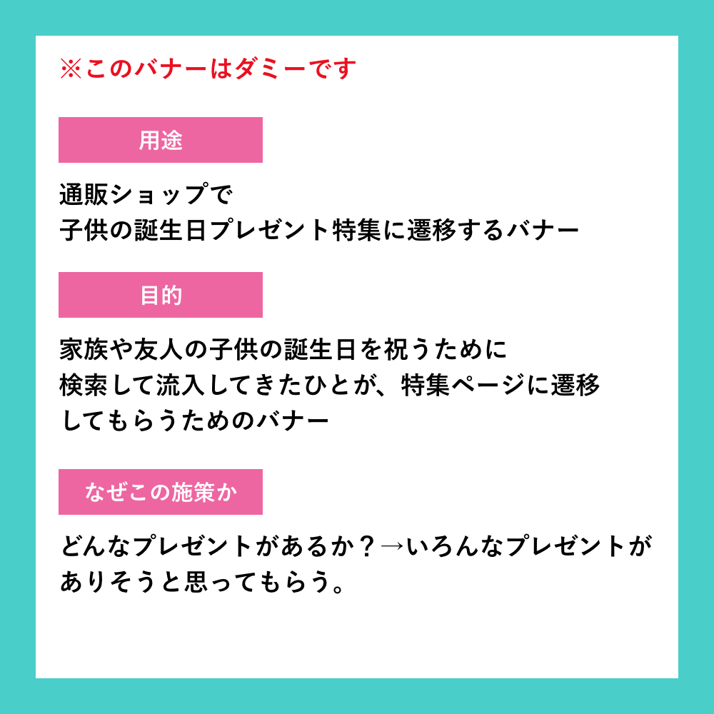 ほぼダミーバナーで、今日はなんの日?というのを調べて、ありそうなダミーバナーを制作していっています。他にも私の日々の出来事をバナーにすると?というのを考えたりしています。用途や目的を書いているほうも、バナーにあわせてさりげなくデザインしています。