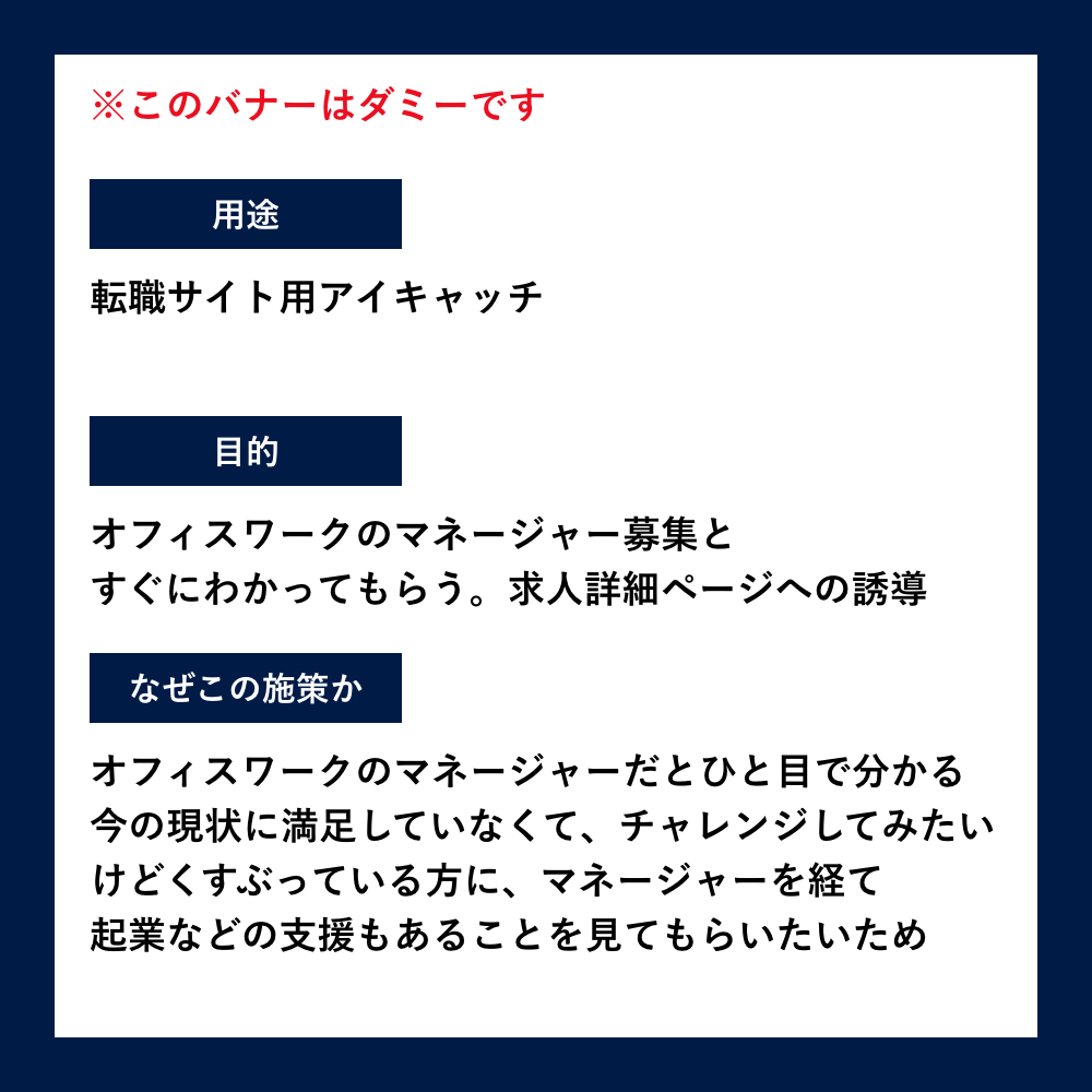 いい上司の日ということで、転職サイト用のアイキャッチバナーをつくってみました。本業もポップ目の画像が多いので、かっちりしたデザインの練習も頑張っていきます!
