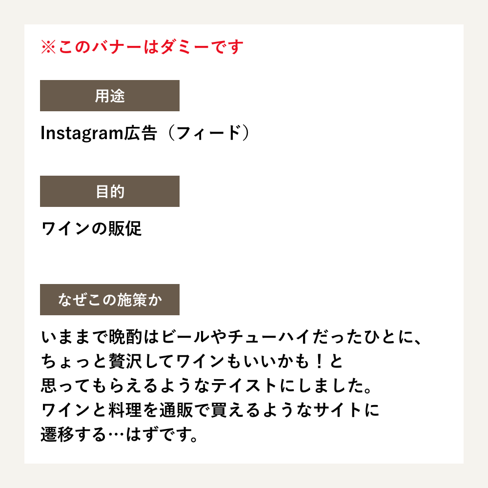 ワインの日から、販促用のInstagramのフィード広告を制作しました。毎日バナーをしはじめて、コピーを考えるのも頑張っている…気がする。