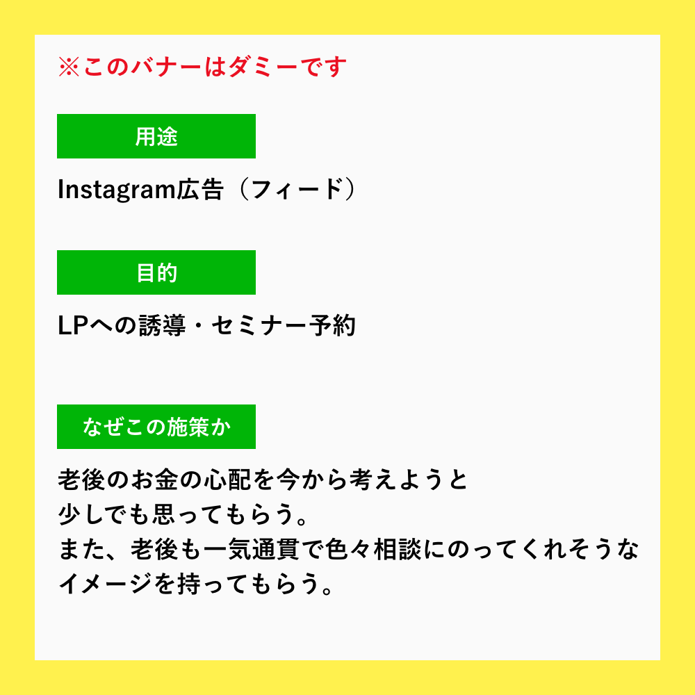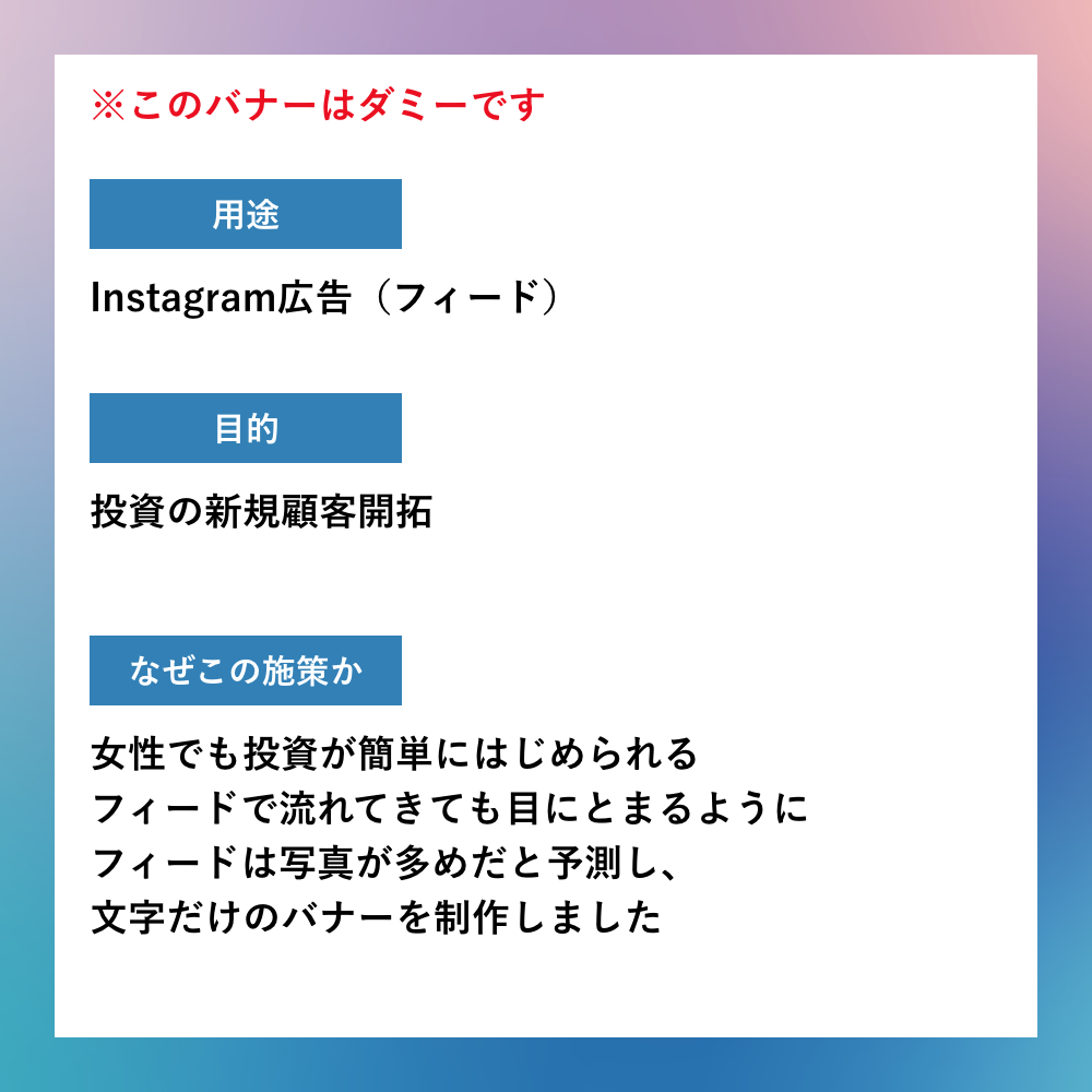 投資の新規顧客開拓のためのInstagram広告をイメージしてつくってみました。久しぶりに人物画像やイラストを入れないバナーな気がします!