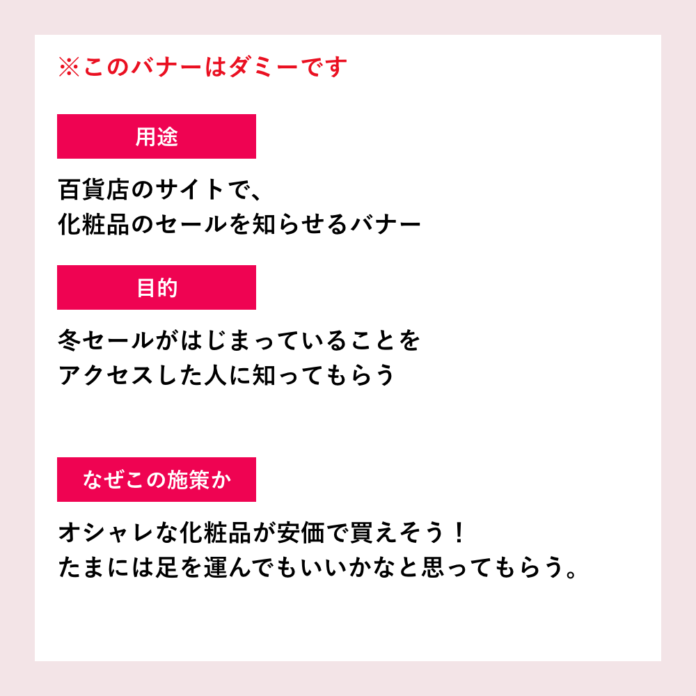11月28日が母親の誕生日だったので、プレゼント…冬、、、セール!とよくわからないつなげ方をして、百貨店のセールを知らせるバナーをつくってみました。