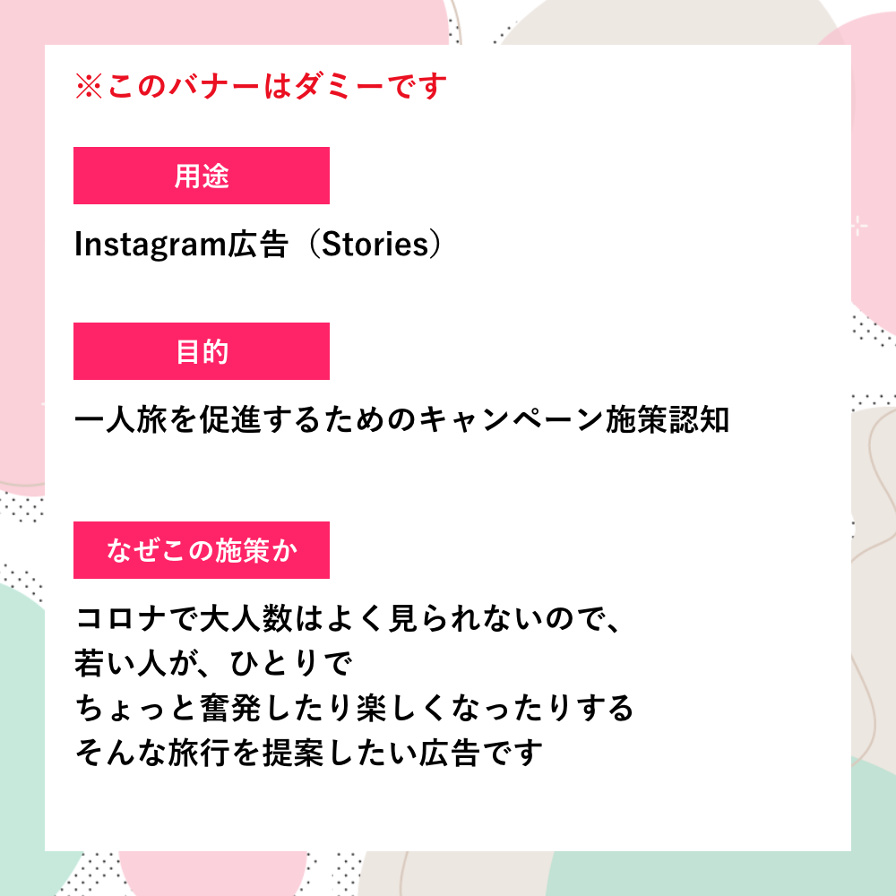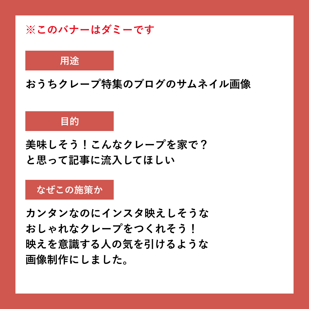 ほぼダミーバナーで、今日はなんの日?というのを調べて、ありそうなダミーバナーを制作していっています。他にも私の日々の出来事をバナーにすると?というのを考えたりしています。用途や目的を書いているほうも、バナーにあわせてさりげなくデザインしています。